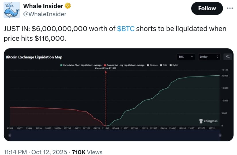 若比特币触及116,000美元,60亿美元空头头寸将面临强平,可能引发市场剧烈波动。来源:@WhaleInsider via X