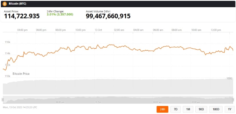 截至发稿,比特币(BTC)交易价格约为114,722美元,24小时上涨3.01%。来源:Brave New Coin比特币价格指数