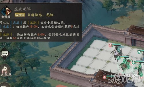 赵云的技能为虎威龙胆,它是一个切换技,可由玩家主动在虎威与龙胆之间进行切换。当该技能切换到虎威效果时,可提升赵云的物攻且受击能额外获得5点战意,若技能的效果为龙胆,则会提高赵云双防,且能消耗50点战意来抵挡一次对方施加的普攻或技能。可以说,虎威更偏向攻击,而龙胆则偏向生存。此外,该技能在切换时会,若赵云本回合使用了技能,则技能的效果为切换后的效果,具有实时生效的特性,因此在使用时无需提前去规划,想用哪一效果直接进行切换即可,也没有切换冷却。