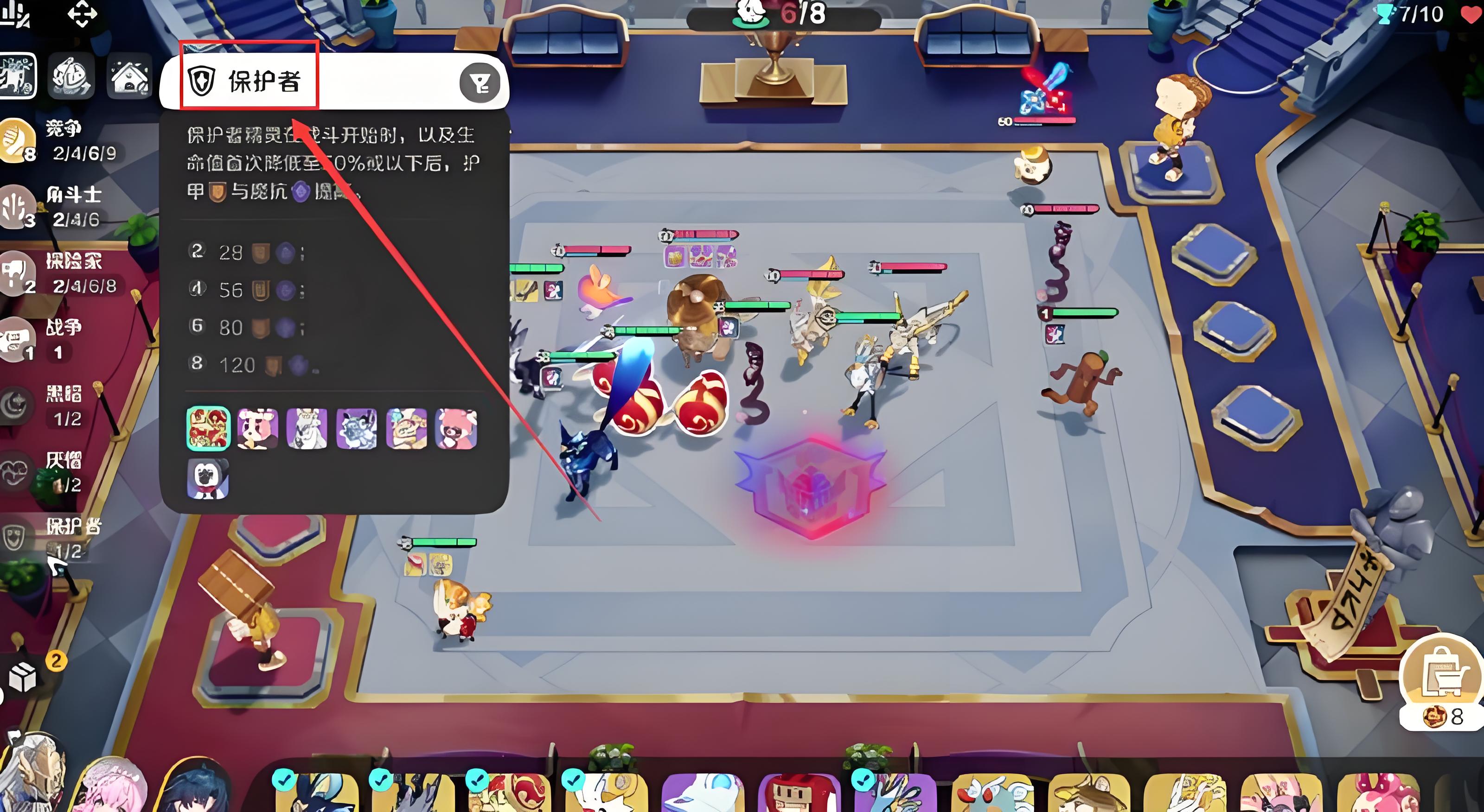 4、保护者属性层数越高双防越强,2层得28点双防8层再得120点,首次受击伤害减半需部署中排靠前位置。