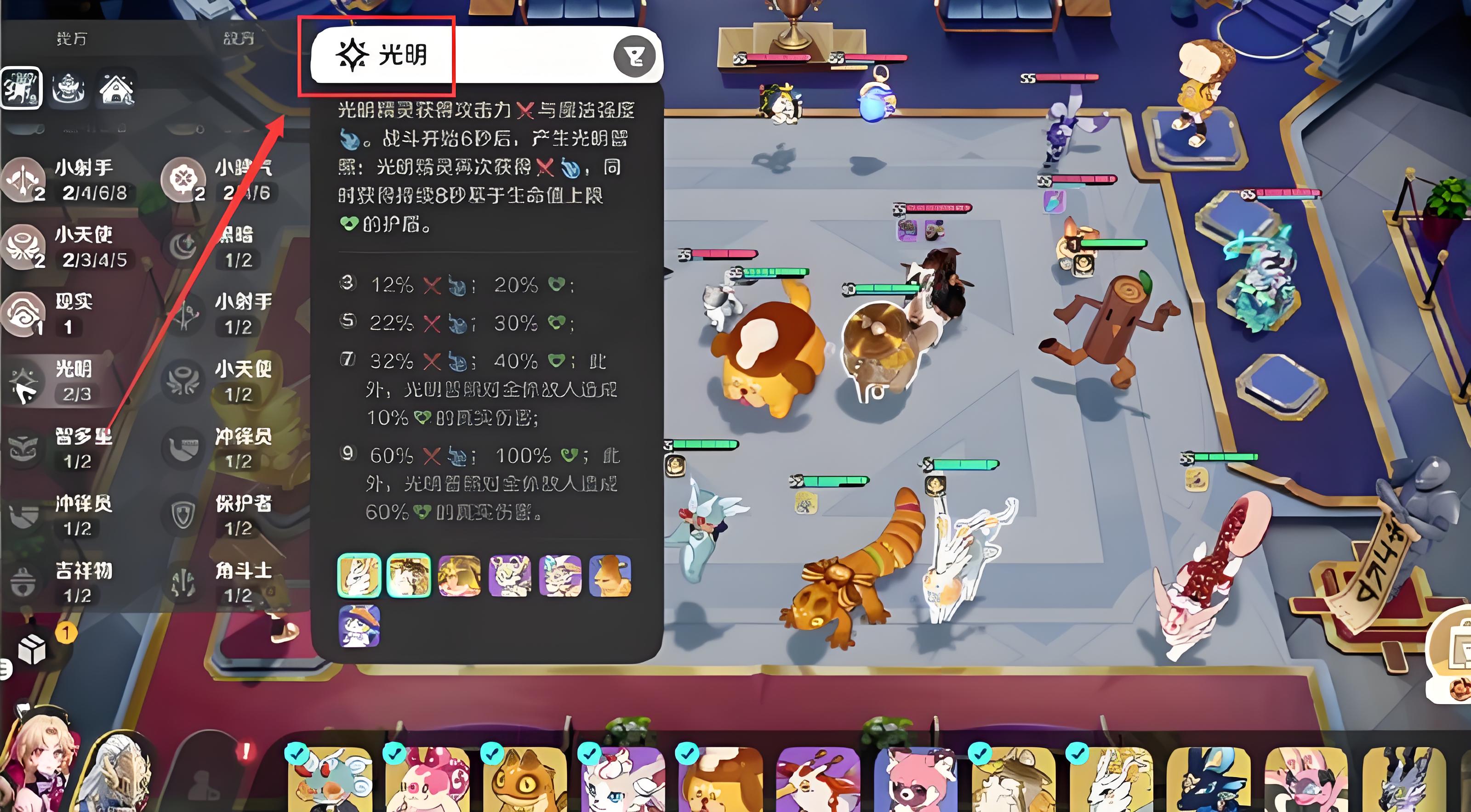 3、光明属性光明精灵越多全队攻击与法术伤害越高,9层以上开场触发普照,造成基于其60%护盾值的真实伤害。