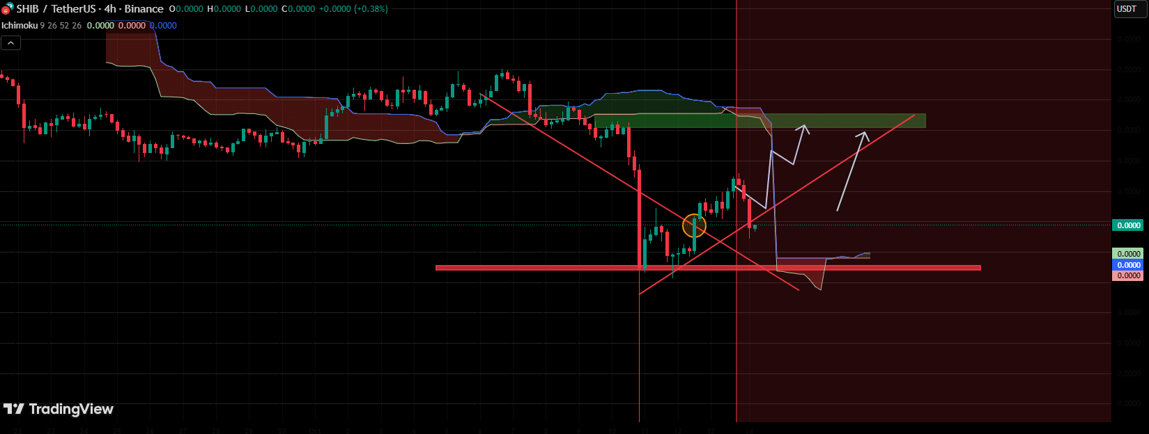分析师发现,柴犬币刚刚在4小时时间框架上突破了下降趋势线。值得注意的是,在10月10日市场崩盘前,该迷因币曾交易于该趋势线上方,随后价格急剧修正至0.0000067美元后快速反弹。