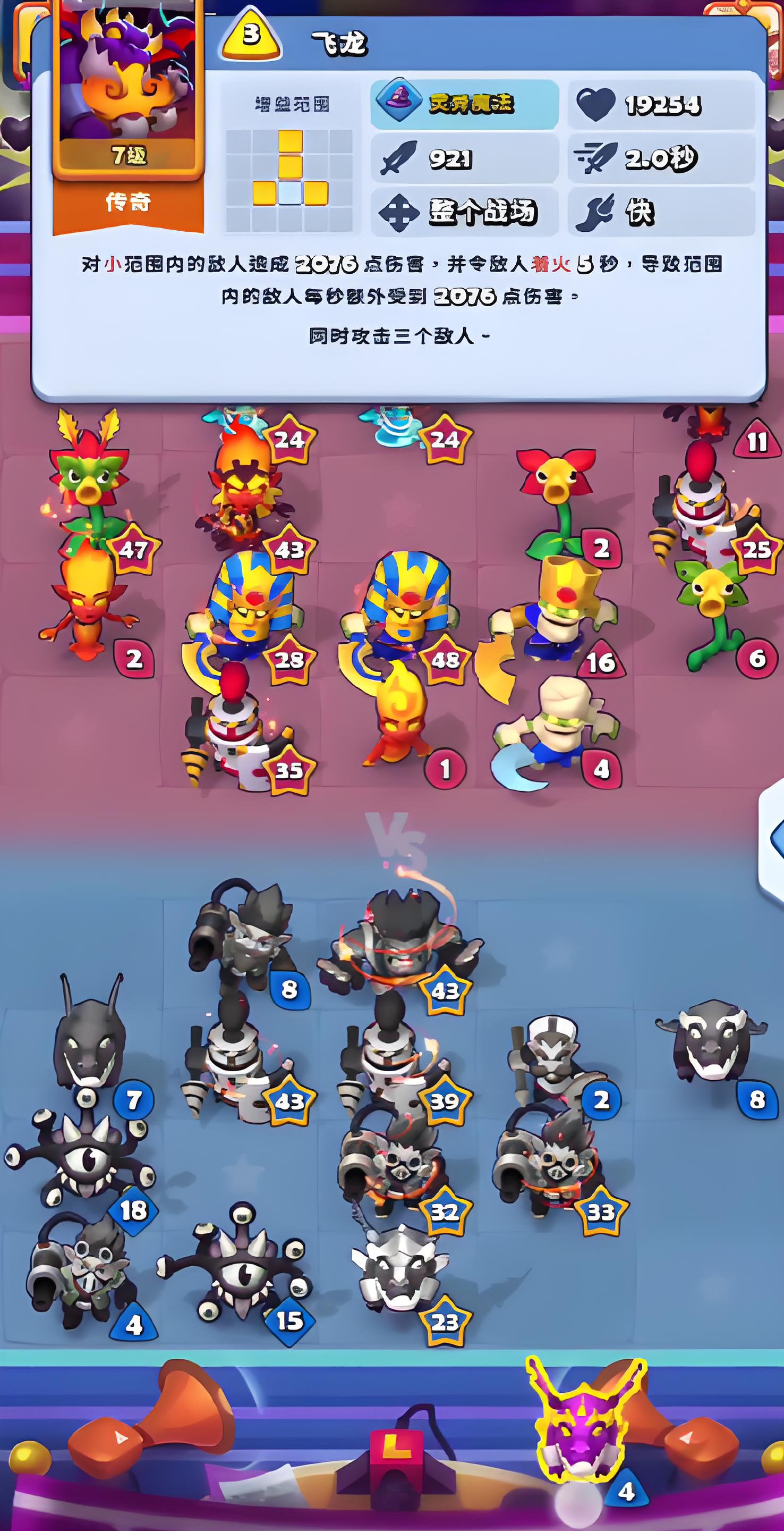 3、飞龙可同时攻击三个目标,AOE战斗中作用突出,搭配豌豆花或祭司能扩散灵异魔法效果,将敌方目标判定从三个扩至十个以上。