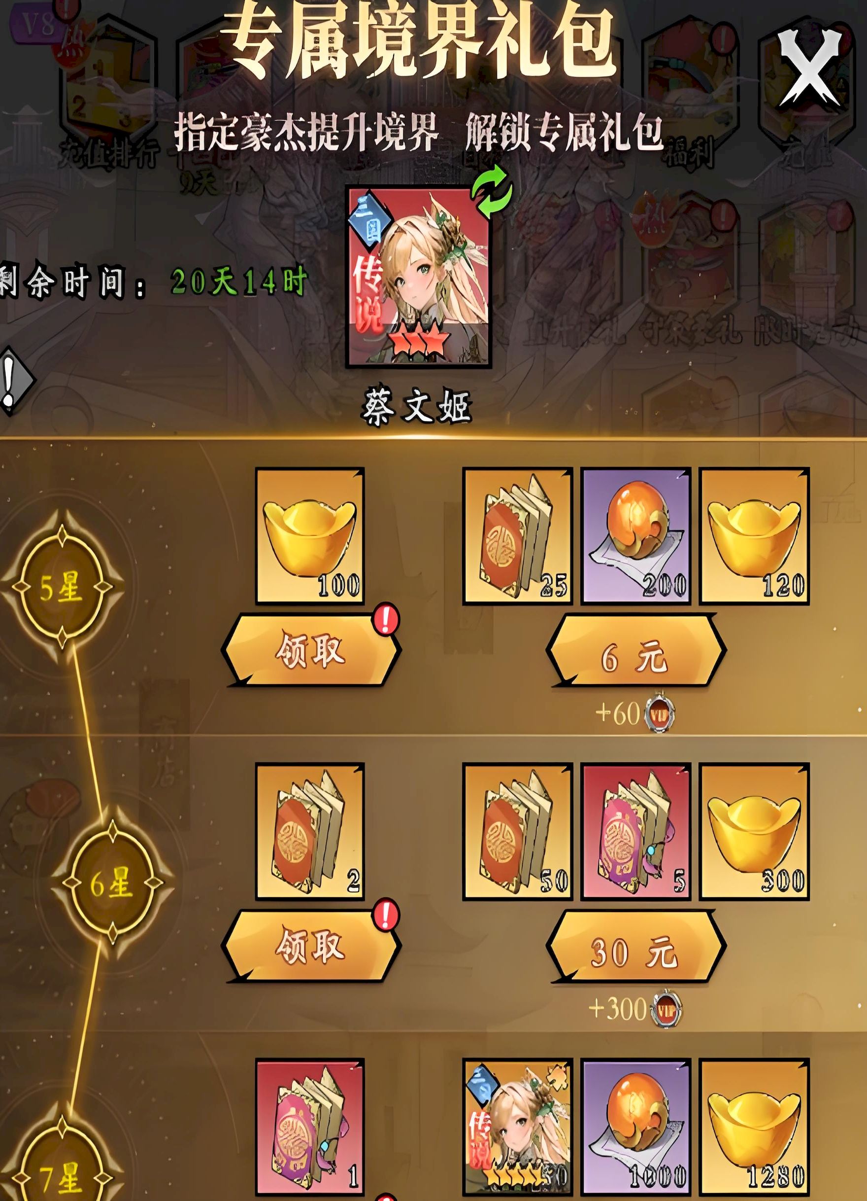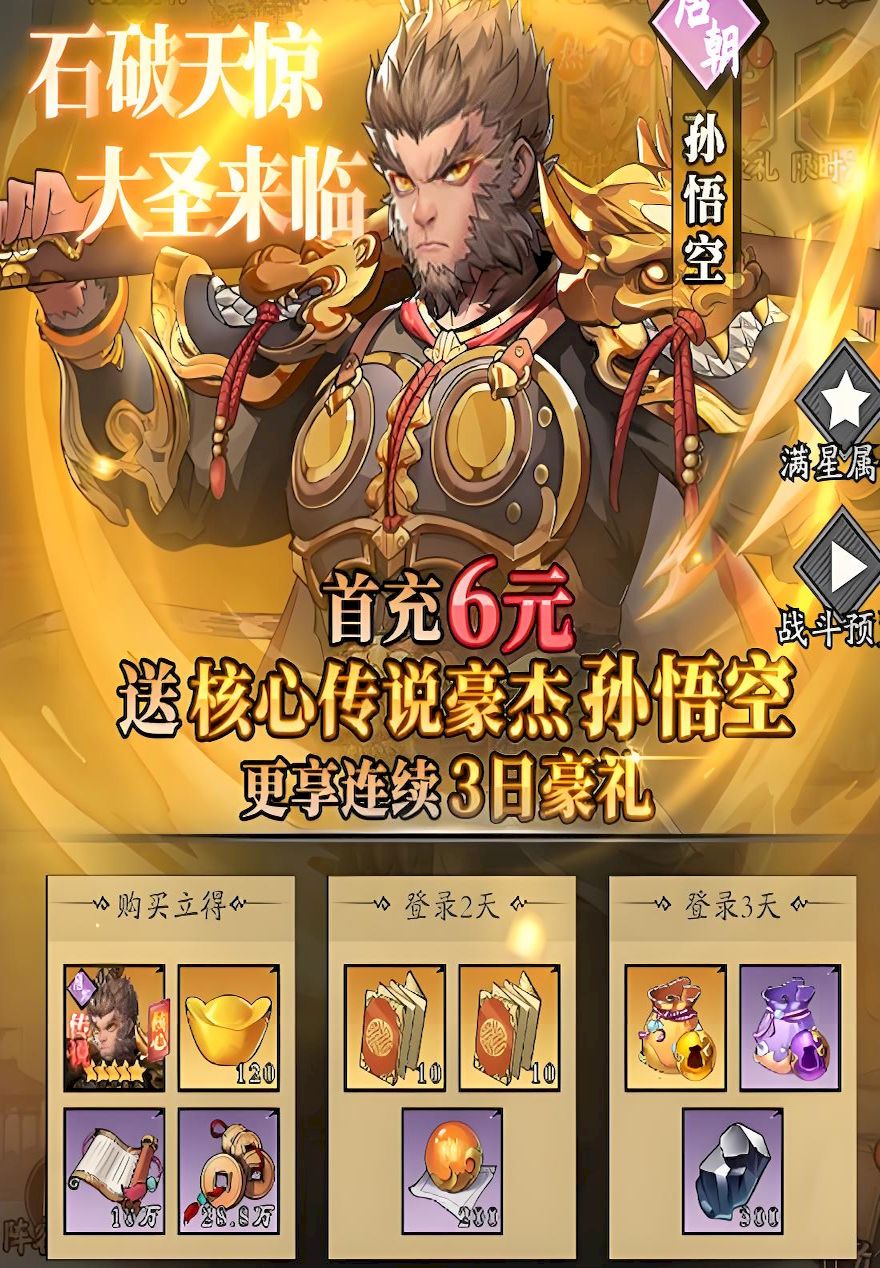 5、新玩家开服重点关注登录奖励,次日登录得杨戬五六日有资源支持,初期快速积累基础豪杰为后续升六星打下稳固基础。