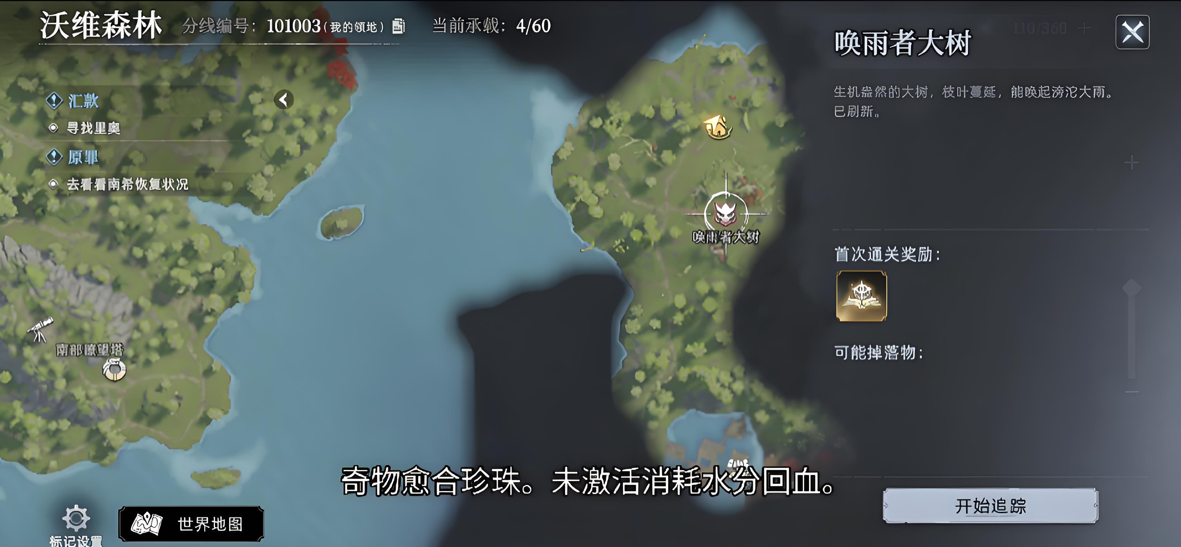 1、获取愈和珍珠需先找大首领唤雨者大树,玩家要打开地图找到目标,等级需满足20级以上,还需准备火属性武器和水分补给品。