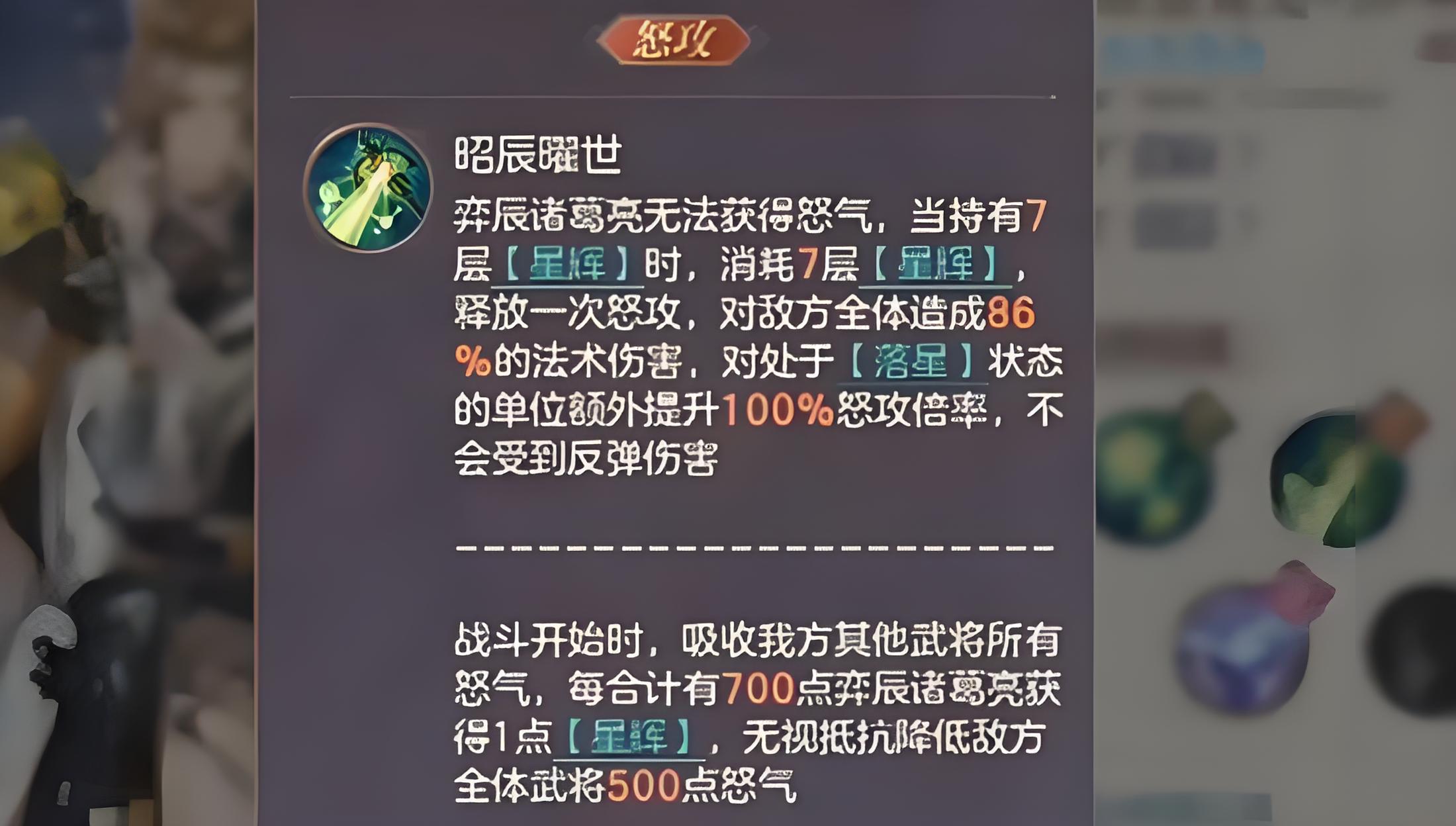 3、战斗开始时会吸收我方其他武将所有怒气,每吸收700点怒气获得1层星辉,同时无视抵抗降低敌方全体怒气,助力快速积累星辉释放怒攻。