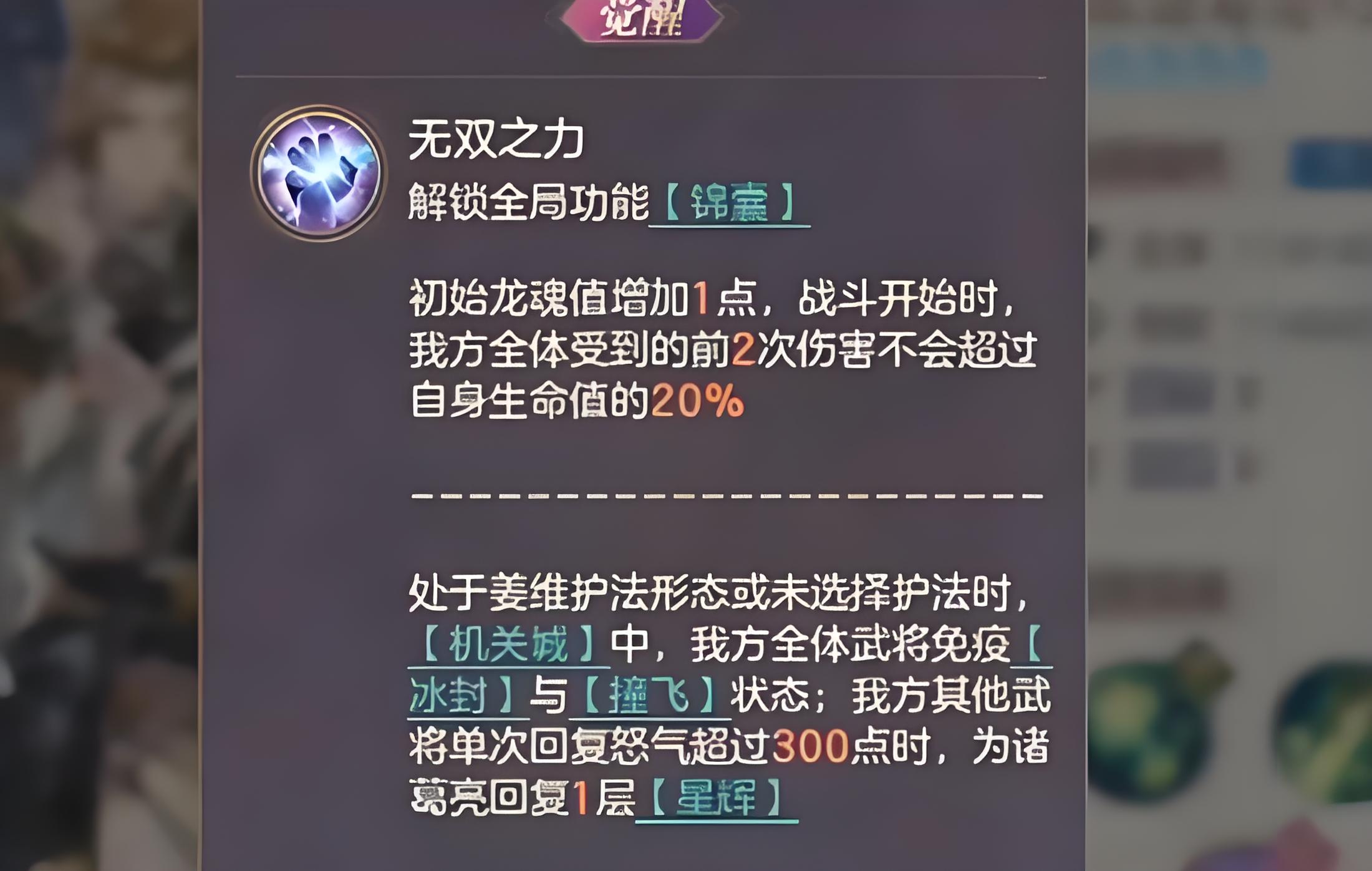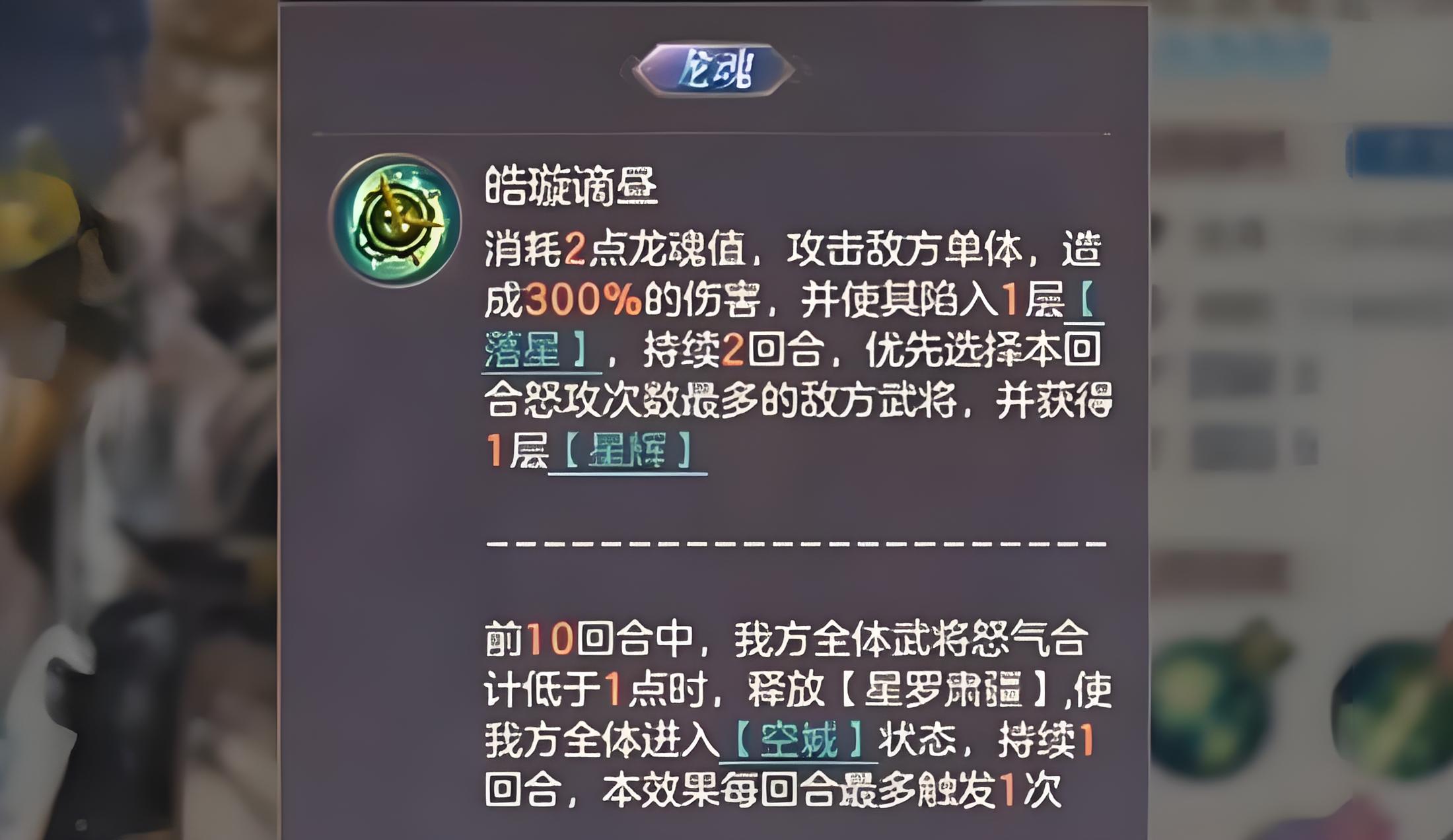 4、龙魂技消耗2点龙魂值,攻击敌方单体造成300%伤害,使其陷入持续2回合的落星状态,优先选择本回合怒攻次数最多的敌方,还能获得1层星辉。