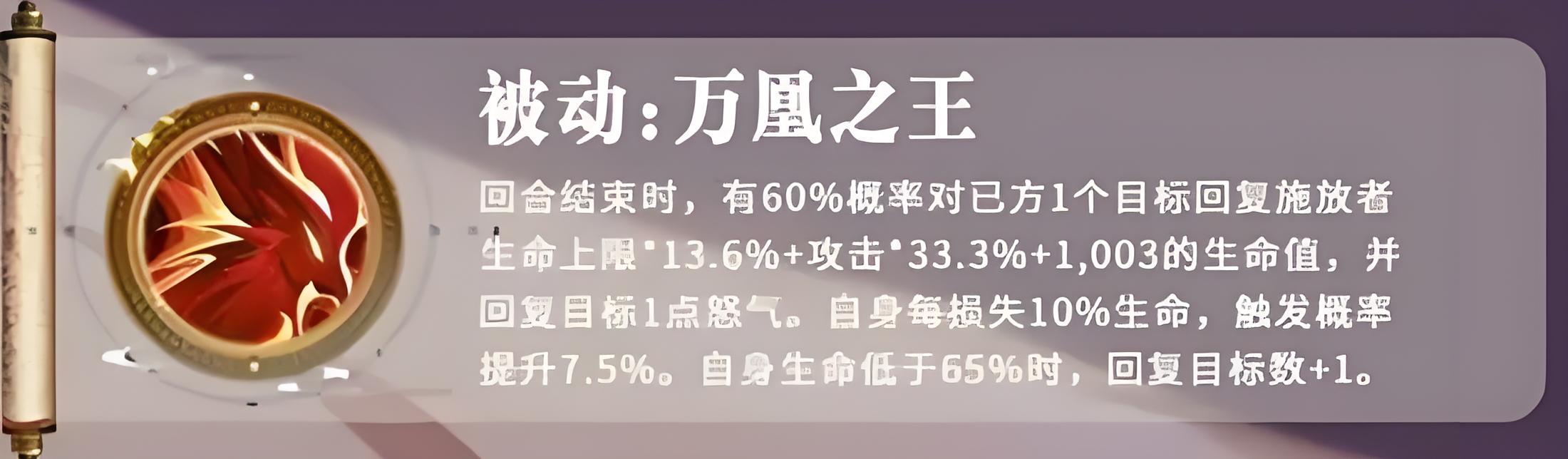 3、被动技能每回合结束可回复己方生命与怒气,自身生命值越低触发概率越高,还能增加回复目标数,兼顾续航与辅助。