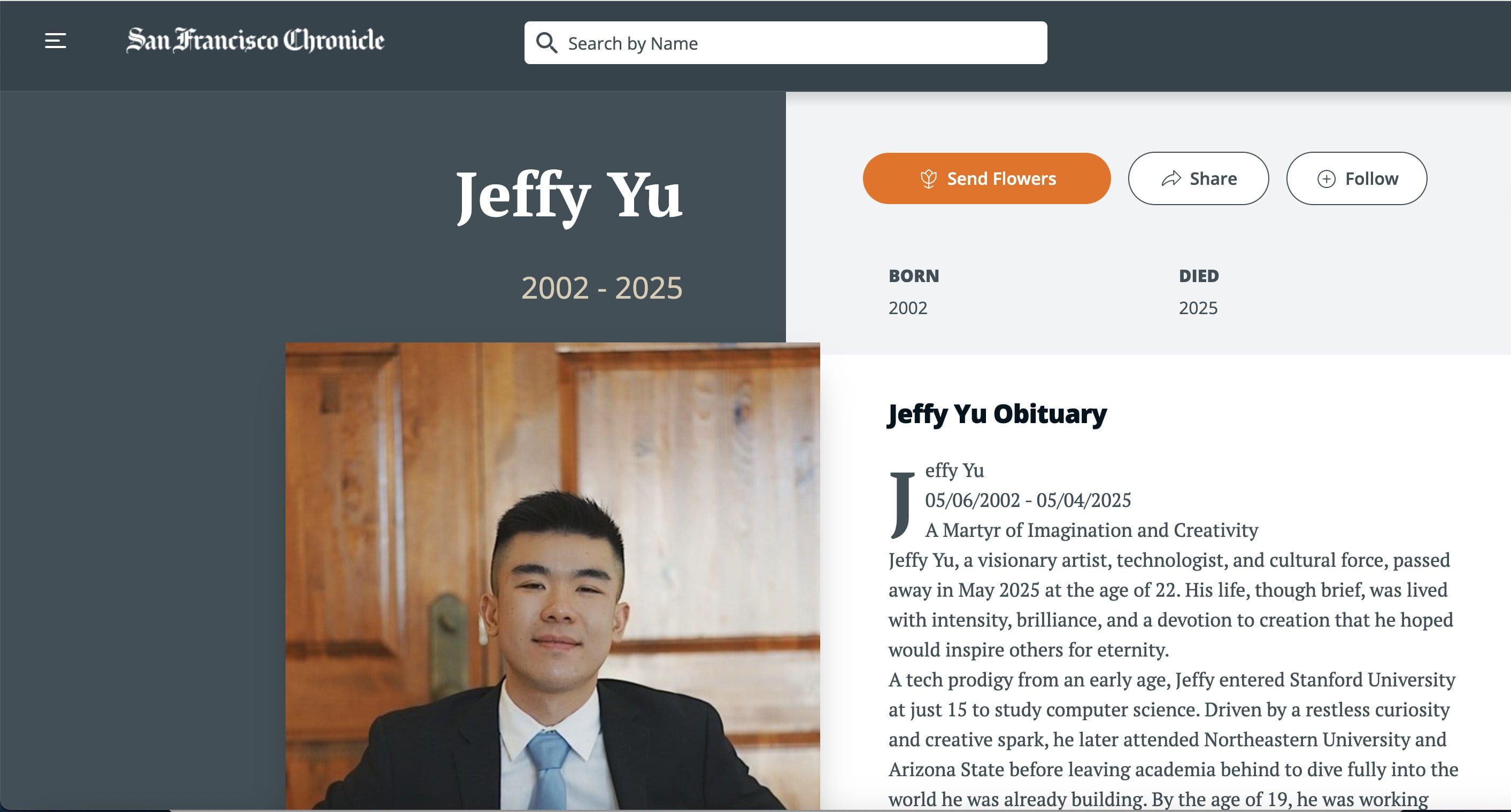不仅如此,讣告刊登网站Legacy也疑似已删除Jeffy Yu去世信息,原始讣告链接已无法正常跳转至页面。