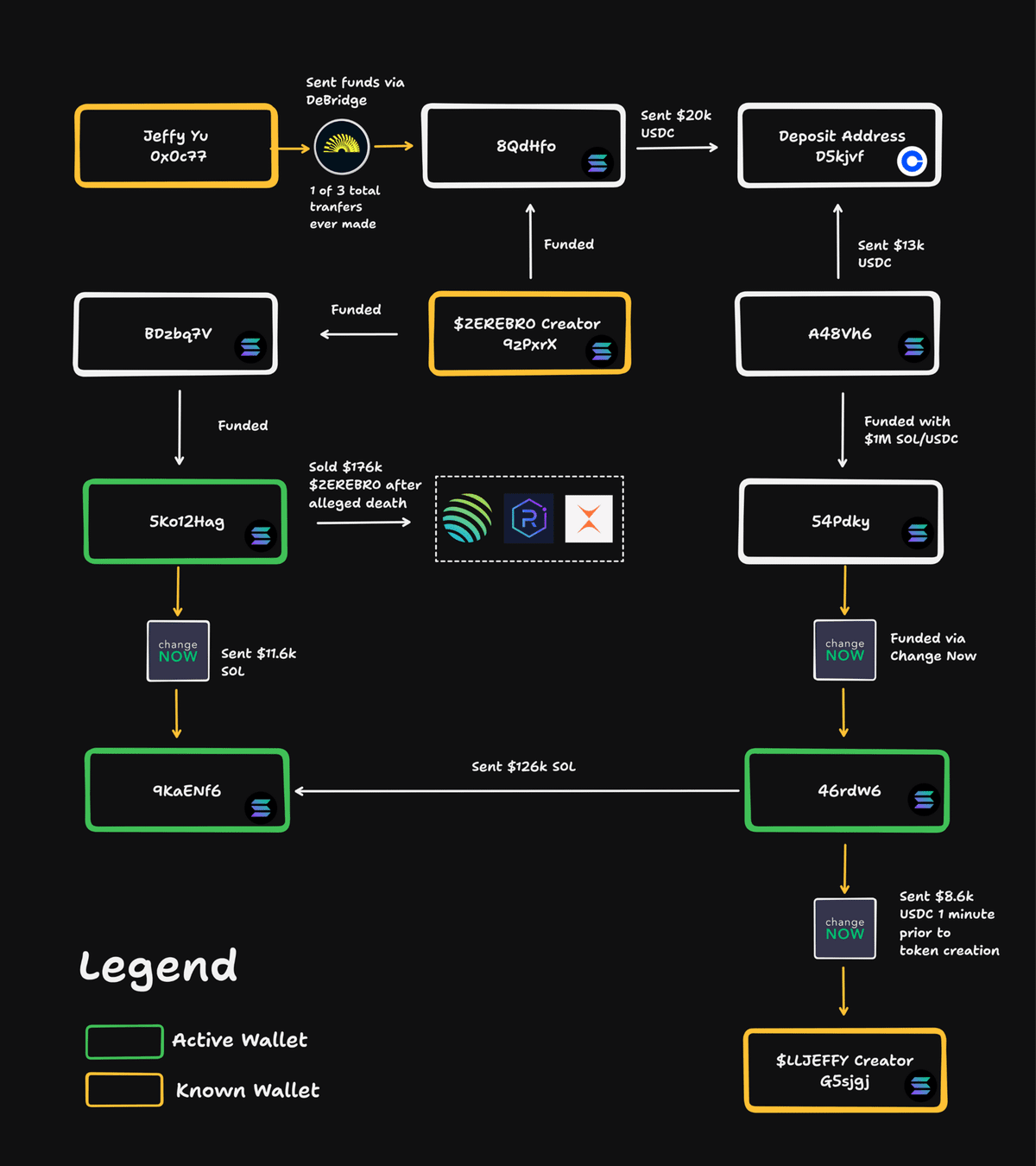 链上数据为事件增添了更多疑点。根据资金流向图,Jeffy Yu(地址0x0c )通过DeBridge向8QdhF0发送了20万美元USDC,随后8QdhF0将13万美元USDC转给D5kjvf(标记为存款地址)。Jeffy还通过BD2bQv向$ZEREBRO创作者地址92prXk提供了资金支持。$ZEREBRO创作者地址随后向5Ko12hAg(标记为活跃钱包)提供了资金支持,该地址在Jeffy“死后”卖出价值17万美元的$ZEREBRO。