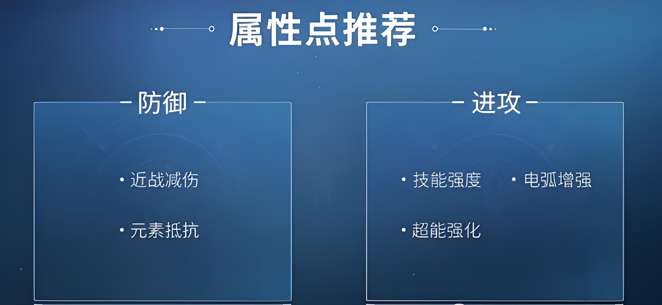4、属性选择攻防侧重不同,防御端优先近战减伤和元素抵抗,进攻端则优先技能强度电弧增强及超能强化强化电系伤害。