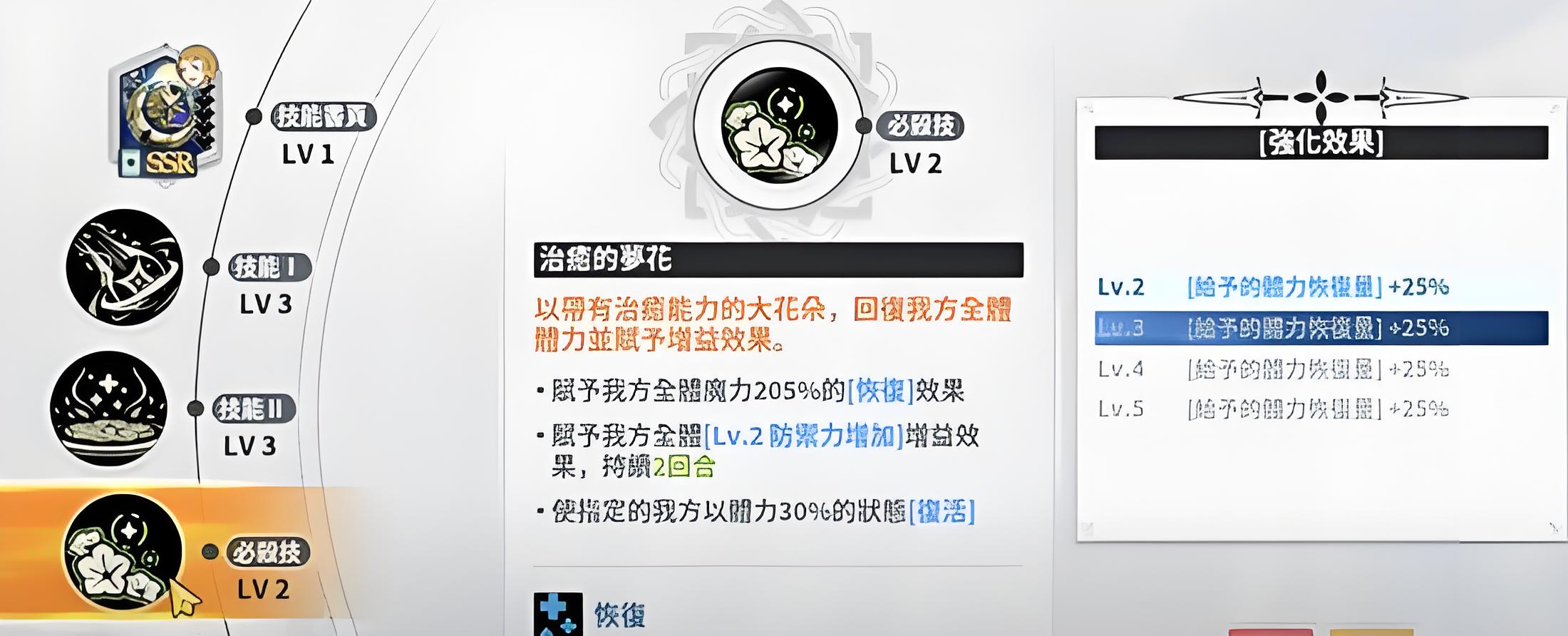 2、必杀技能为全体队友恢复大量生命值,对低血量角色追加治疗,提升品质后附加全队防御增益,特定条件下可复活阵亡队友。