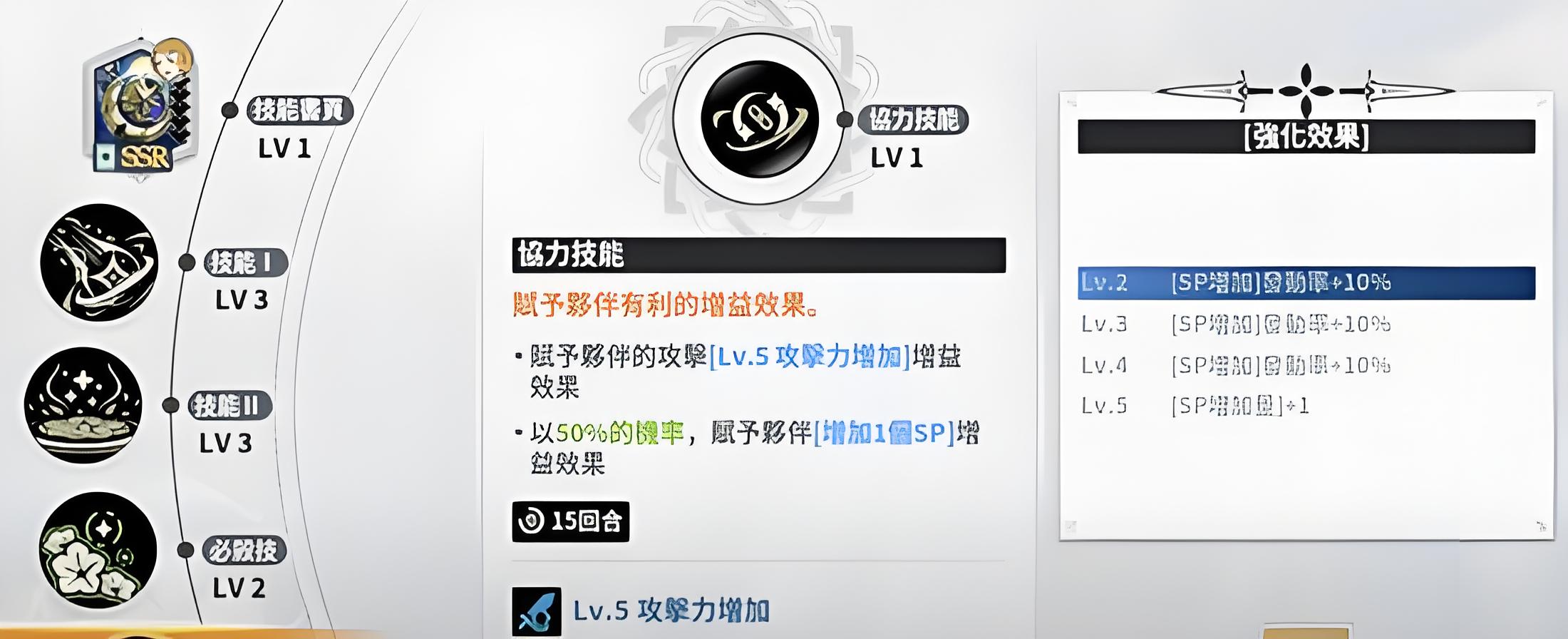 3、协力技能为队友提供攻击、暴击率增益及少量生命回复,使用后自身输出也会强化,配合羁绊技能能提升团队持续作战能力。