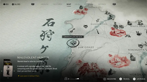 深红染料海滩位于石狩平原西北海岸的石颚海岸。您可以在地图屏幕上的 Stone Jaw Coast 标签中找到“Stone”一词以北的海滩。