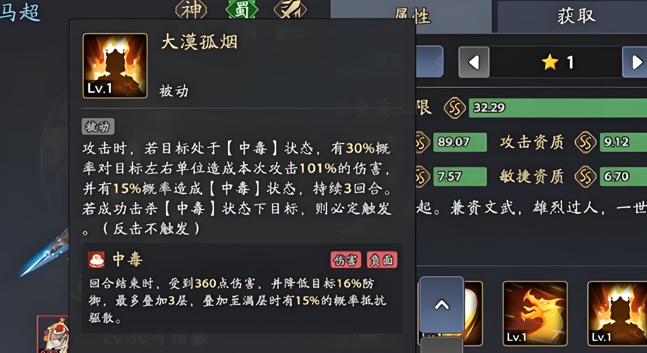 5、马超攻击中毒目标概率对其左右单位造成伤害或附加中毒,击杀中毒目标必定触发额外效果,阵容搭配需结合该特性最大化输出。