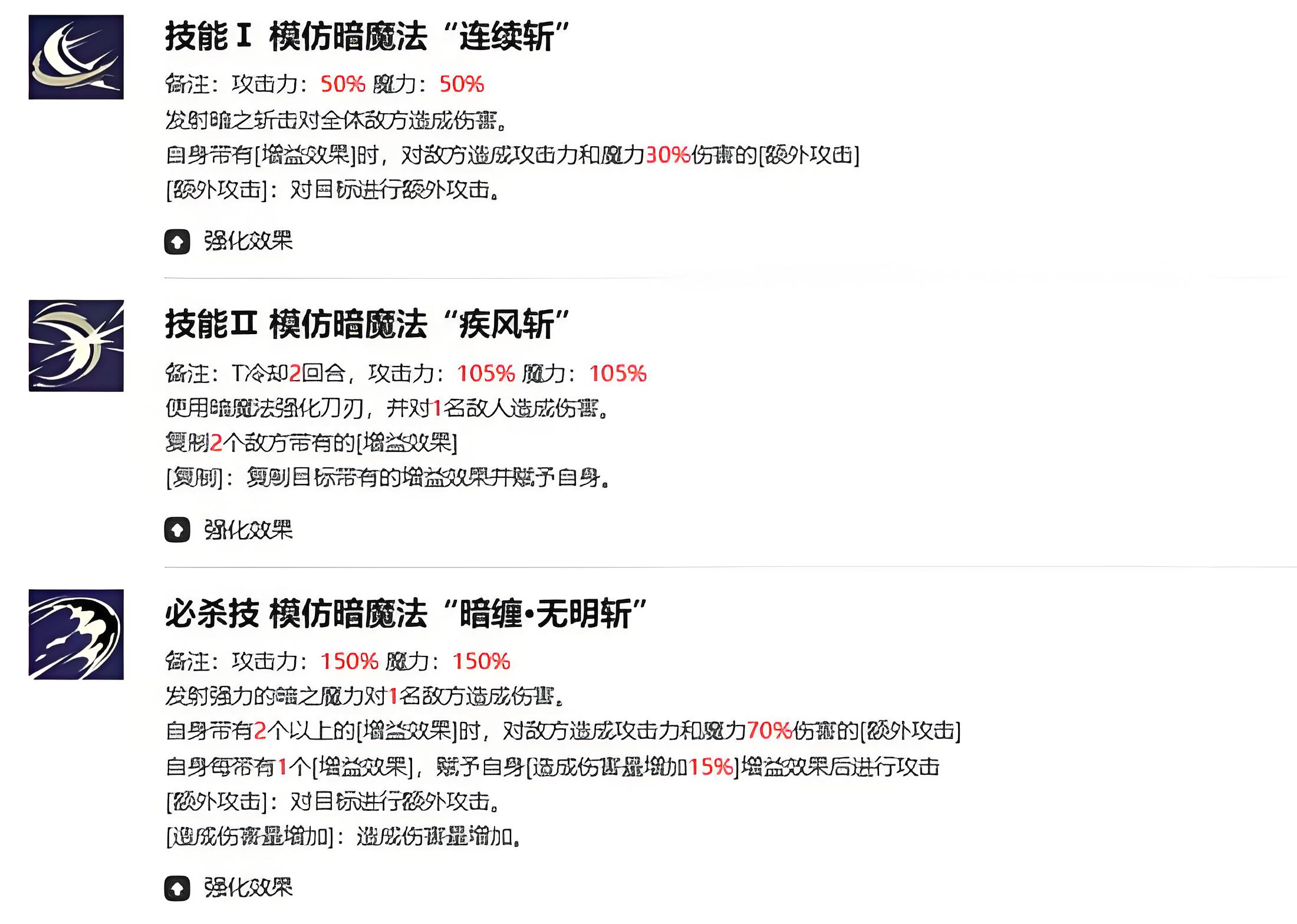 3、必杀技暗缠无明斩对单伤害高,有150%攻击力与魔力加成,自身带2个以上增益时会触发额外攻击,还能按增益数量提升伤害量。