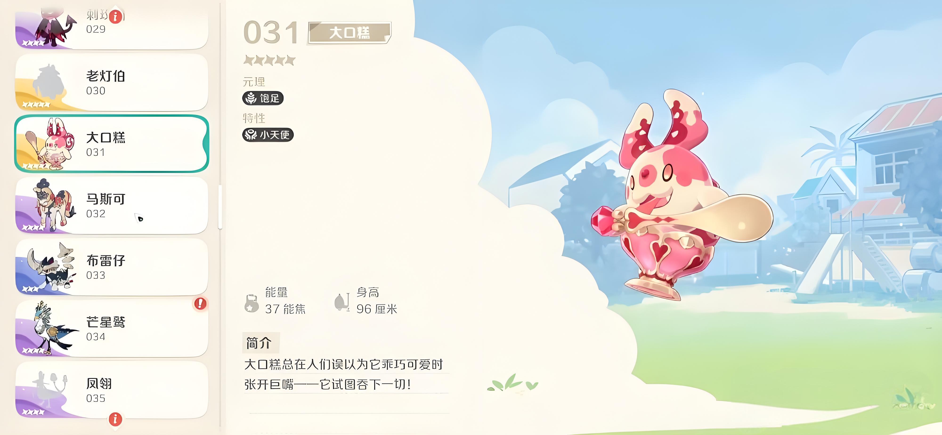 1、大口糕属后排辅助型魔法输出精灵,元理为饱足,特性是小天使,身高96厘米,常在他人以为它乖巧时张开巨嘴,试图吞下一切。