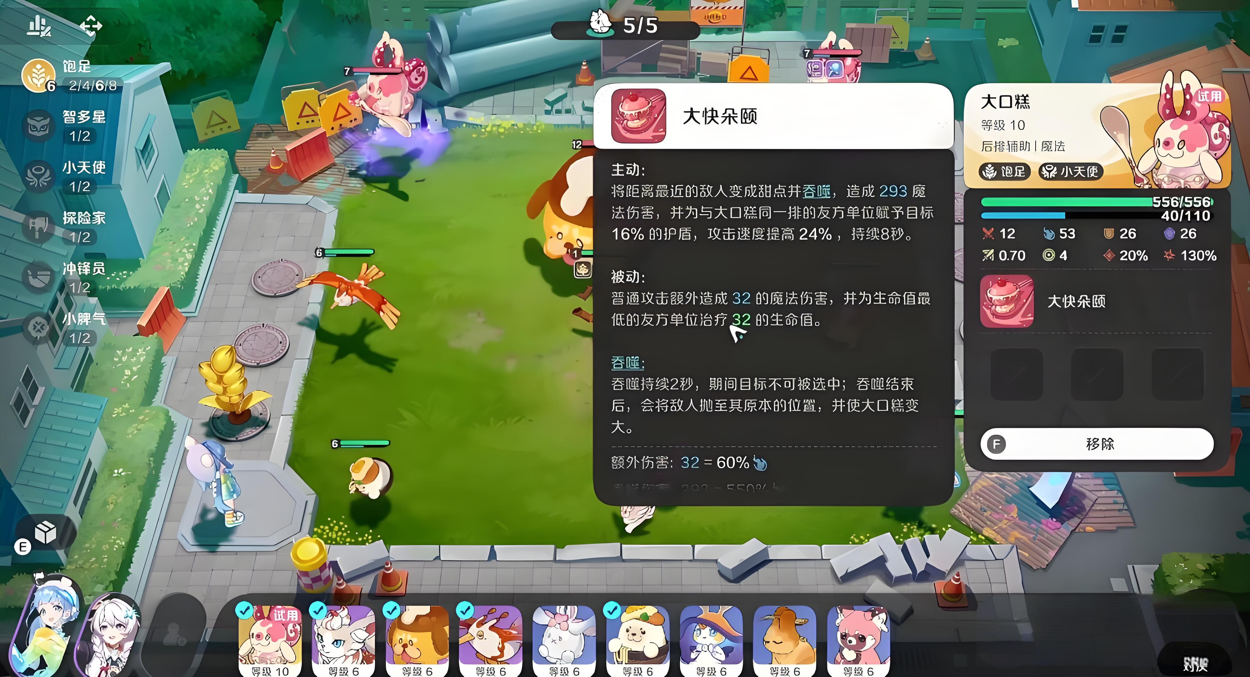 2、主动技能大快朵颐可将最近敌人变糕点吞噬,造成魔法伤害,还为同排友方加护盾与攻速,护盾占目标16%,攻速提24%,持续8秒。