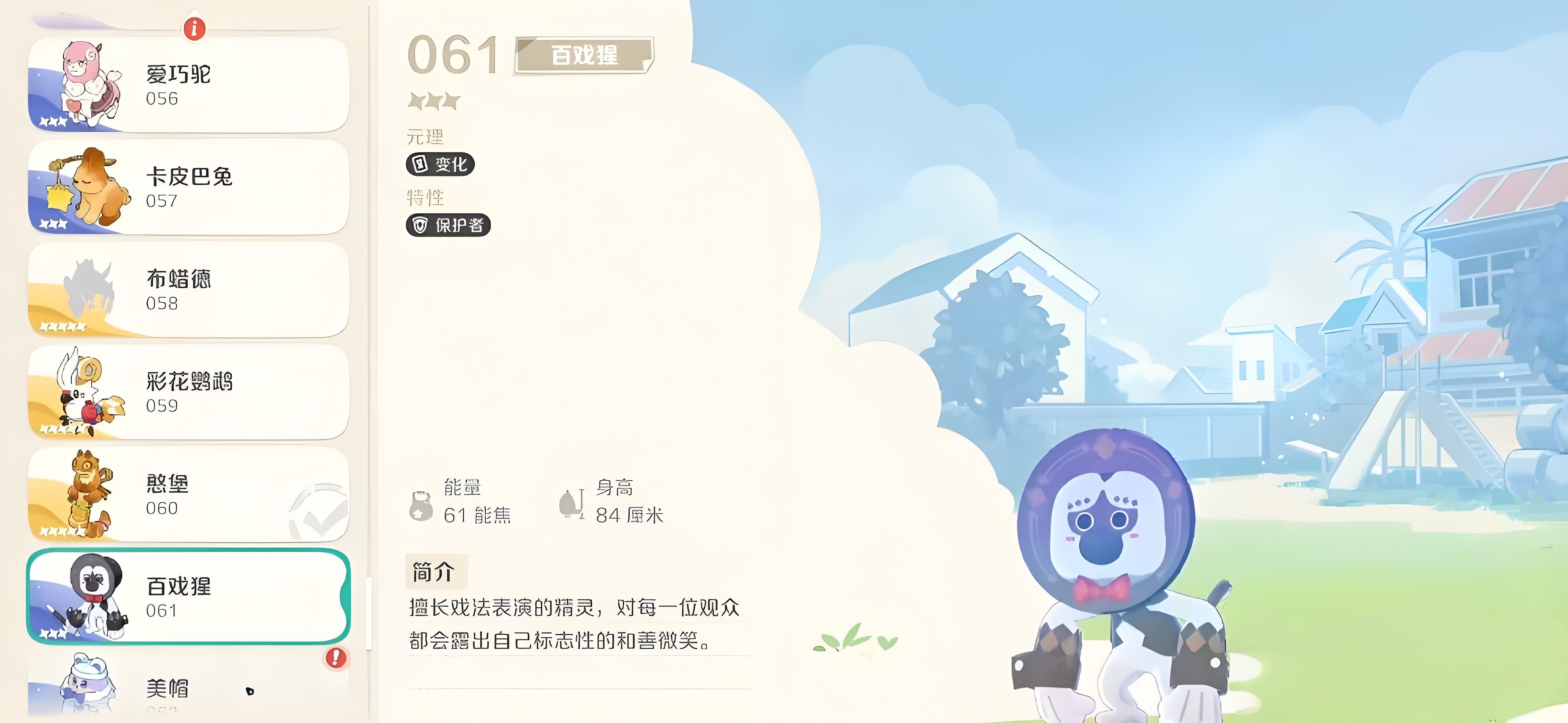 1、百戏猩定位前排承伤精灵,主打魔法伤害输出,元理归属变化类别、特性为保护者,符合前排肉盾常见定位,能在前排为队友吸收伤害。