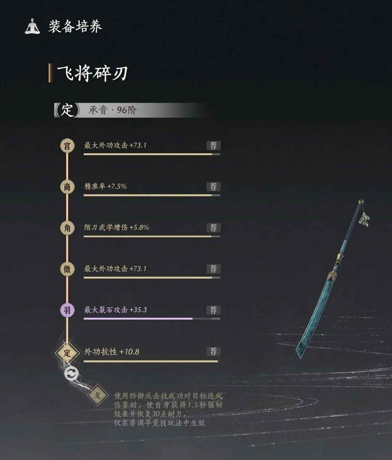 其他没有的不适合pve。虚构一个版本毕业面板大致为精准99%+,会意15%,会心56%,大攻3500必带陌刀增。