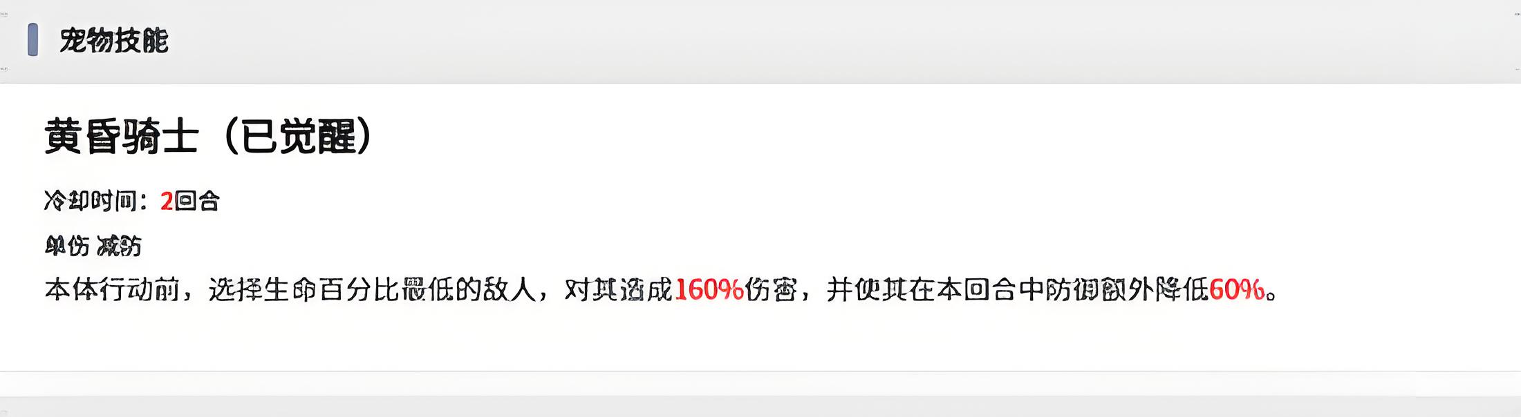 3、觉醒宠物技能冷却2回合,行动前选残血敌造160%伤害,本回合降防60%,兼具破防与残血收割能力。