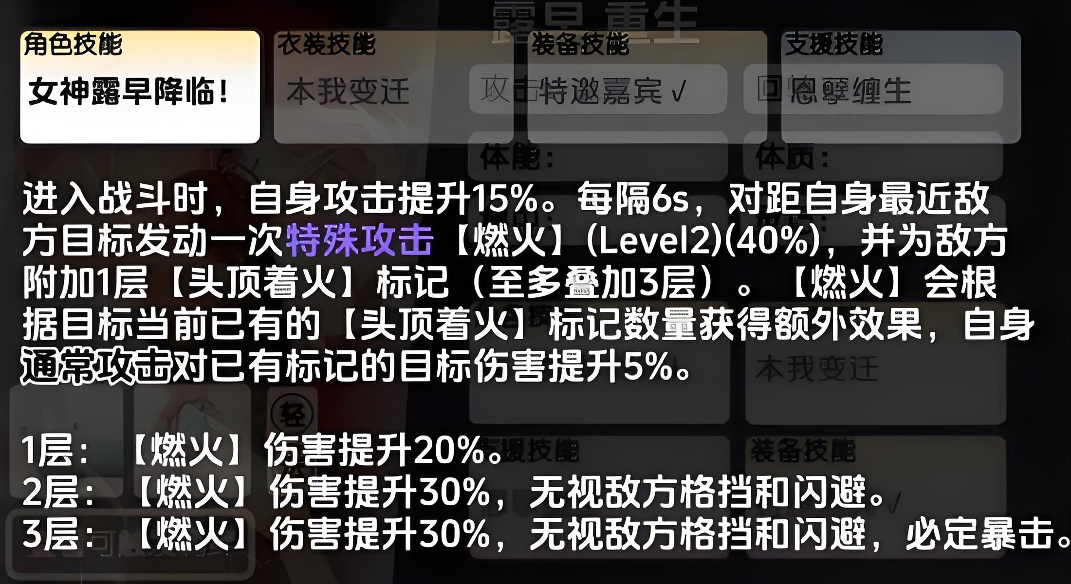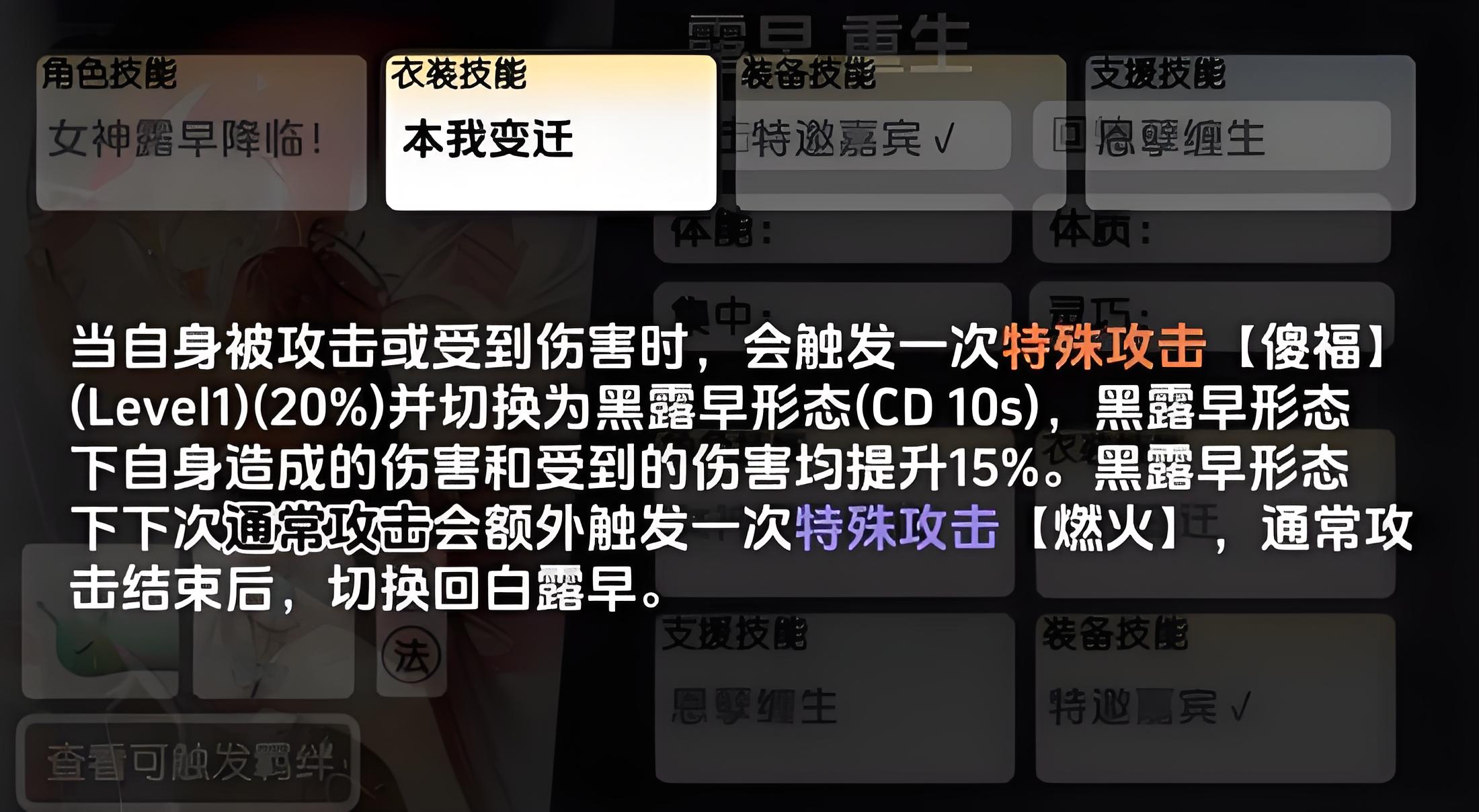 3、衣装技能受攻击或造成伤害时触发傻福攻击,切换黑露早形态持续10秒,此形态伤害与受伤害均提15%,普攻额外触发燃火。