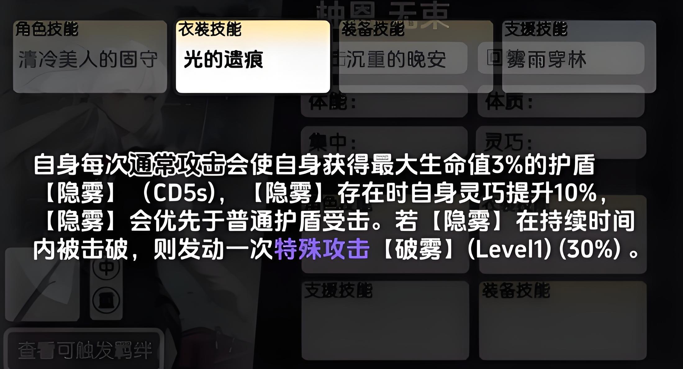 2、衣装技能光的遗痕让柚恩普攻获得最大生命值3%隐雾护盾,持续5秒且优先承伤,存在时提升10%灵巧被击破则触发破雾造成额外伤害。