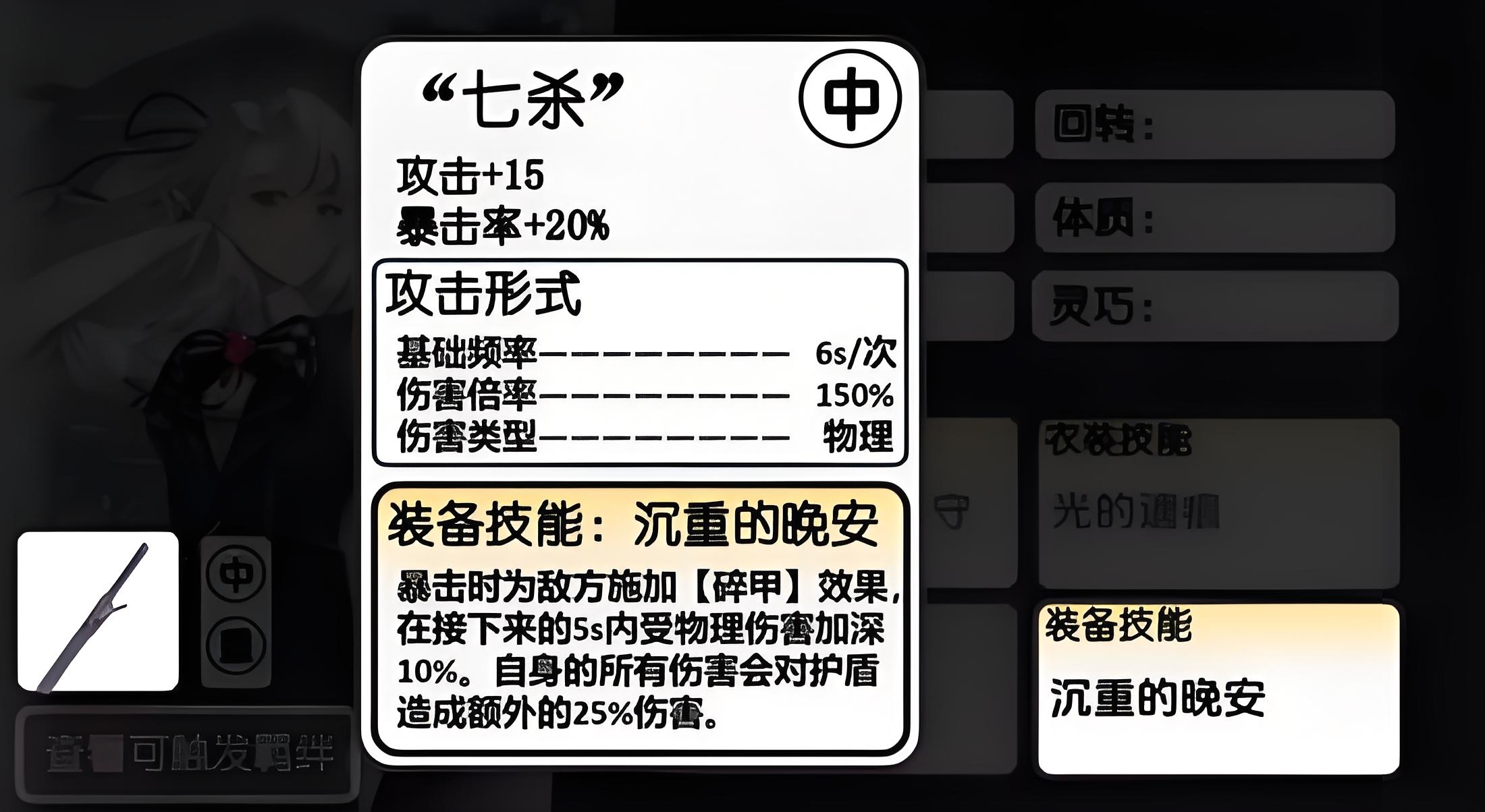 3、装备选择沉重的晚安暴击时给敌人上碎甲使其5秒内受物理伤害加深10%,自身所有伤害对敌方护盾造成额外30%破坏效果。