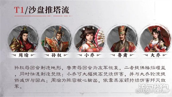 孙权每回合制造地形,鲁肃每回合为友军恢复,二者提供格挡增益同时快速制造焚烧;小乔可大幅提高焚烧伤害,同时提供受伤核复和每回合恢复的特殊增益;周瑜、孙尚香为阵容核心输出,对焚烧目标和地形效果有额外加成。