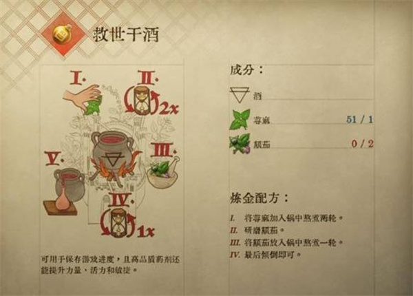 虽然你在首次访问Trosky地区的酒馆时会得到一瓶较弱的救世干酒,但如果你想在背包中拥有更多,你就得购买或自己制作。