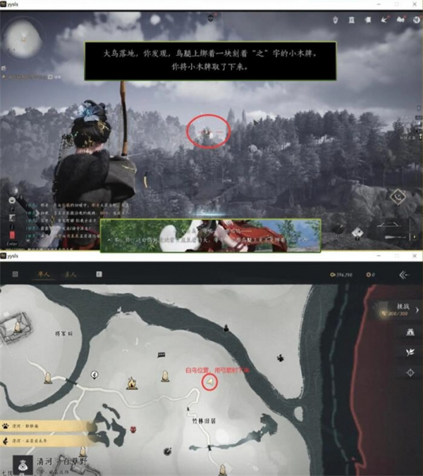 3、接着我们射落飞的最高的鸟,鸟的位置如下图所示,就能获得之字小木牌;