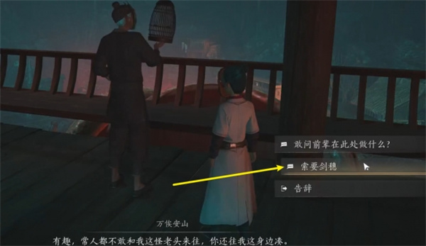 4、随后我们乔装成年年,来到鬼市后面的桥上,找到万俟安山索要剑穗。