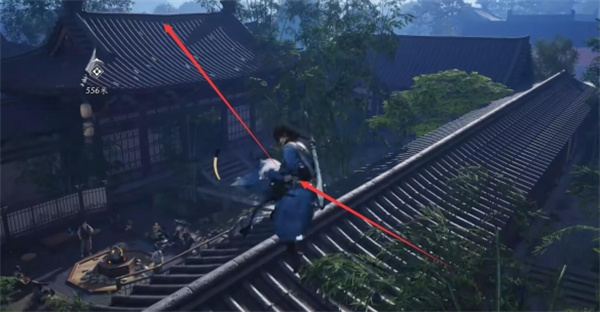 2、不要从房顶下去,继续往前面的房顶跳来到图示位置;