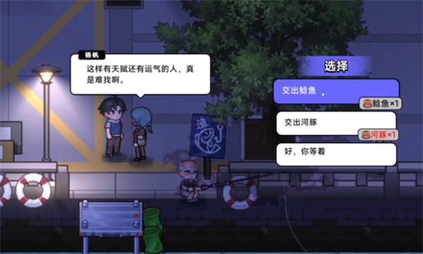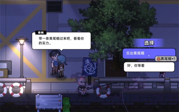 2、来到河边,跟杨帆对话,接受她的钓鱼比赛。