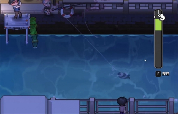 3、掏出渔具开始钓鱼,按住绿色的QTE收杆。