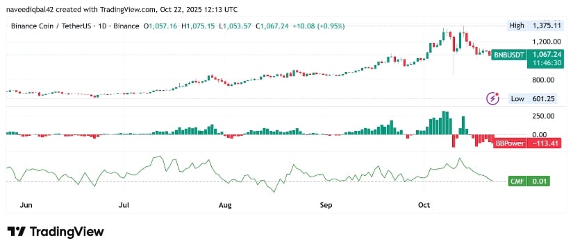 截至发稿,BNB/USD交投于1,069美元附近,较本月稍早1,375美元的高点有所回落。TradingView图表显示代币在急跌后进入盘整,价格波动收窄于关键支撑与阻力区间之间。