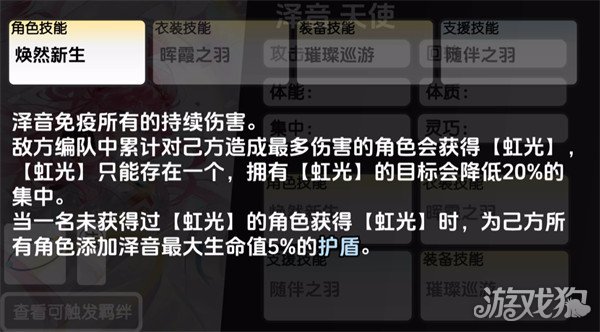 泽音的角色技能叫做焕然新生,使用的时候泽音会免疫对面带来的所有持续伤害,而且会在敌方编队中累计对己方造成最多伤害的角色带来一个负面影响,此类敌人身上会获得一个【虹光】状态的影响,虽然是一个负面的影响但是【虹光】只能存在一个,不能叠加,一般拥有【虹光】状态影响的目标会降低20%的集中。,当一名未获得过【虹光】的敌人第一次获得【虹光】影响时,还会为己方所有角色添加泽音最大生命值5%的护盾进行防御。