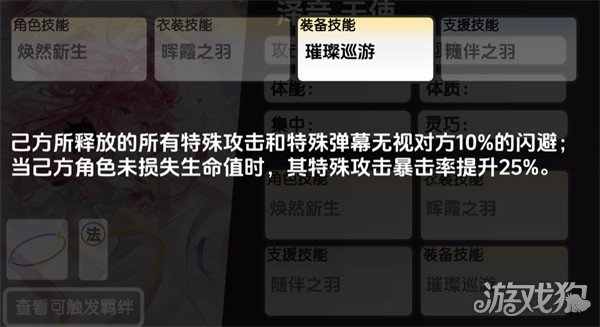 泽音的装备技能可以选择璀璨巡游,这个技能的效果会让己方所释放的所有特殊攻击和特殊弹幕无视对方10%的闪避当己方角色未损失生命值时,带来的特殊攻击暴击率提升25%,最后再支援技能上面泽音可以用的就是随伴之羽这个技能,这个技能是当己方首次有角色生命值降低至一定百分比的时候,会为为这个角色回复其最大生命值的5%,当然这里生效的百分比还是比较多的,比如95%以及60%以下的时候可以触发,还有30%以及5%以下时也可以触发这个回复效果。