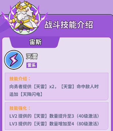 1、宙斯天雷技能为勇者提供天雷,命中敌人后追加天降闪电,随着等级提升可增加天雷数量,强化输出频率与覆盖范围。