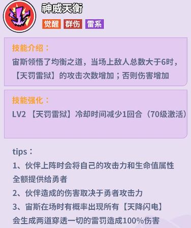 5、宙斯实战有三点关键提示,上阵时为勇者提供全额攻防属性,伤害依赖勇者攻击力,特定情况下天降闪电会生成穿透雷罚。