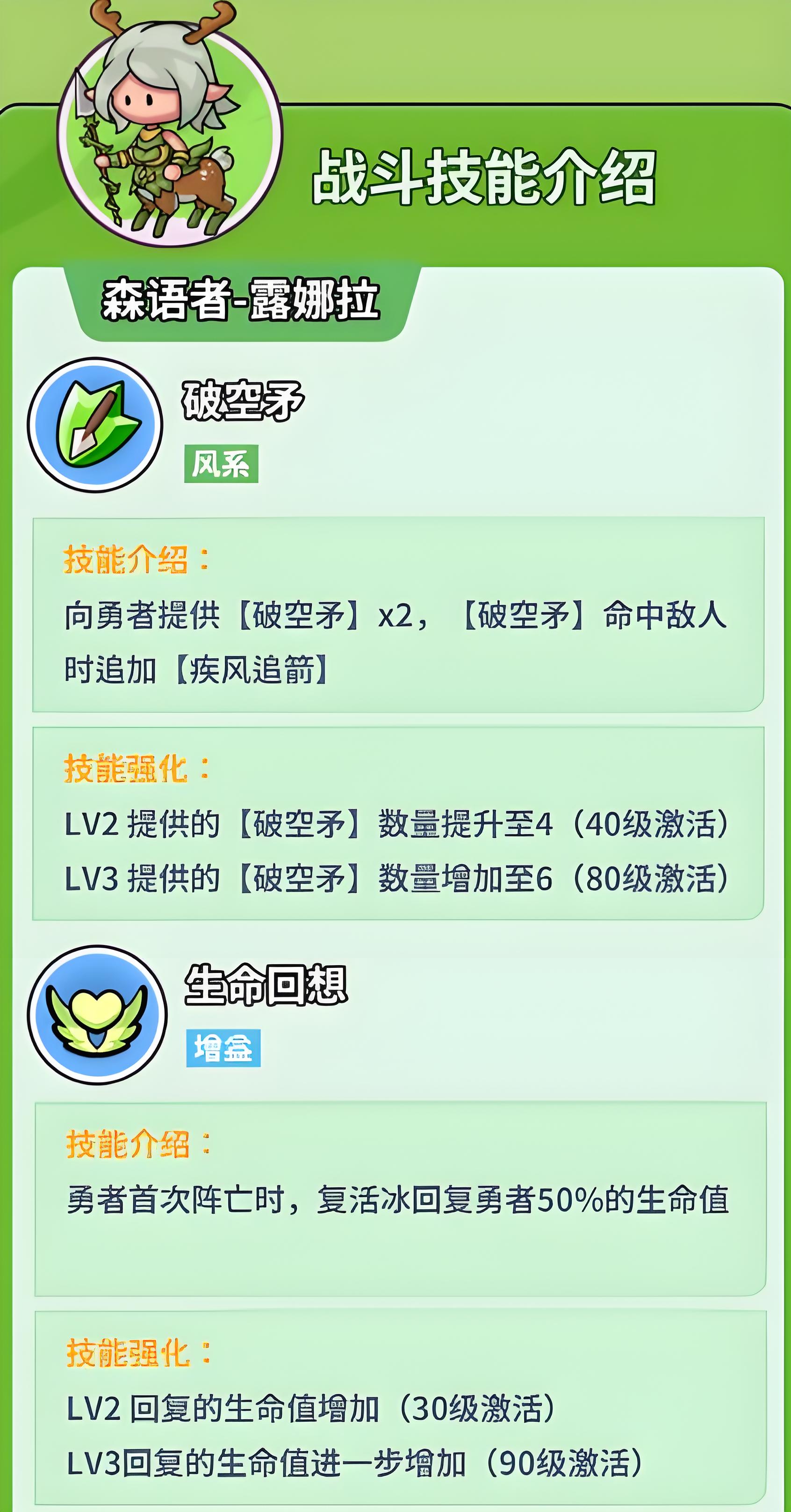 1、露娜拉破空矛技能为勇者提供2个破空矛,命中敌人后会追加疾风追箭,40级时激活等级2可将数量增至4个,80级激活LV3进一步增至6个。