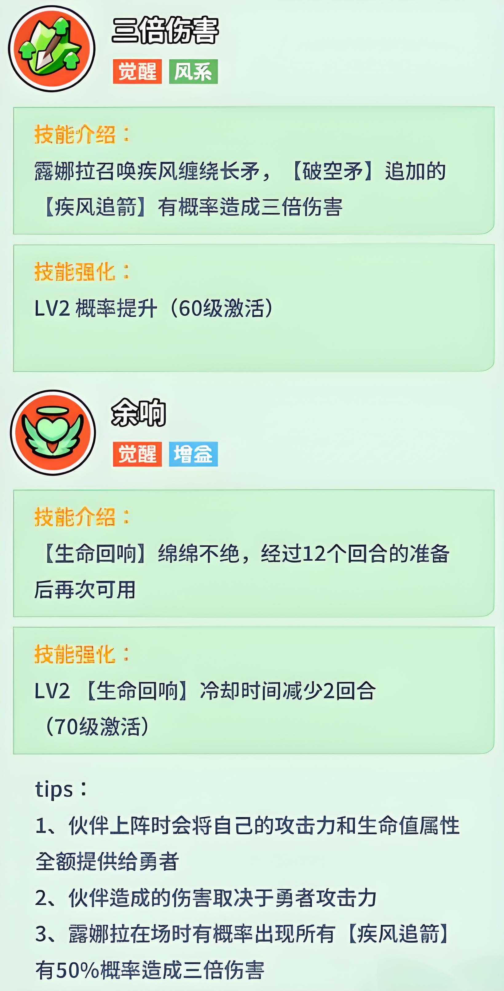 3、露娜拉三倍伤害技能召唤疾风缠绕长矛,使疾风追箭有概率造成三倍伤害效果,60级时激活等级2可提升该技能触发概率数值。