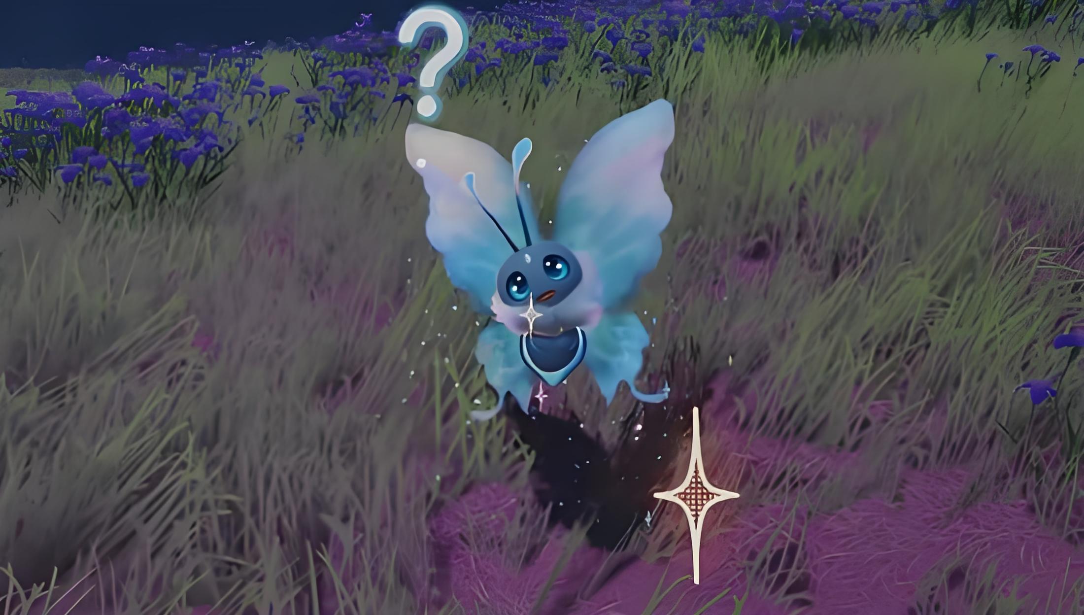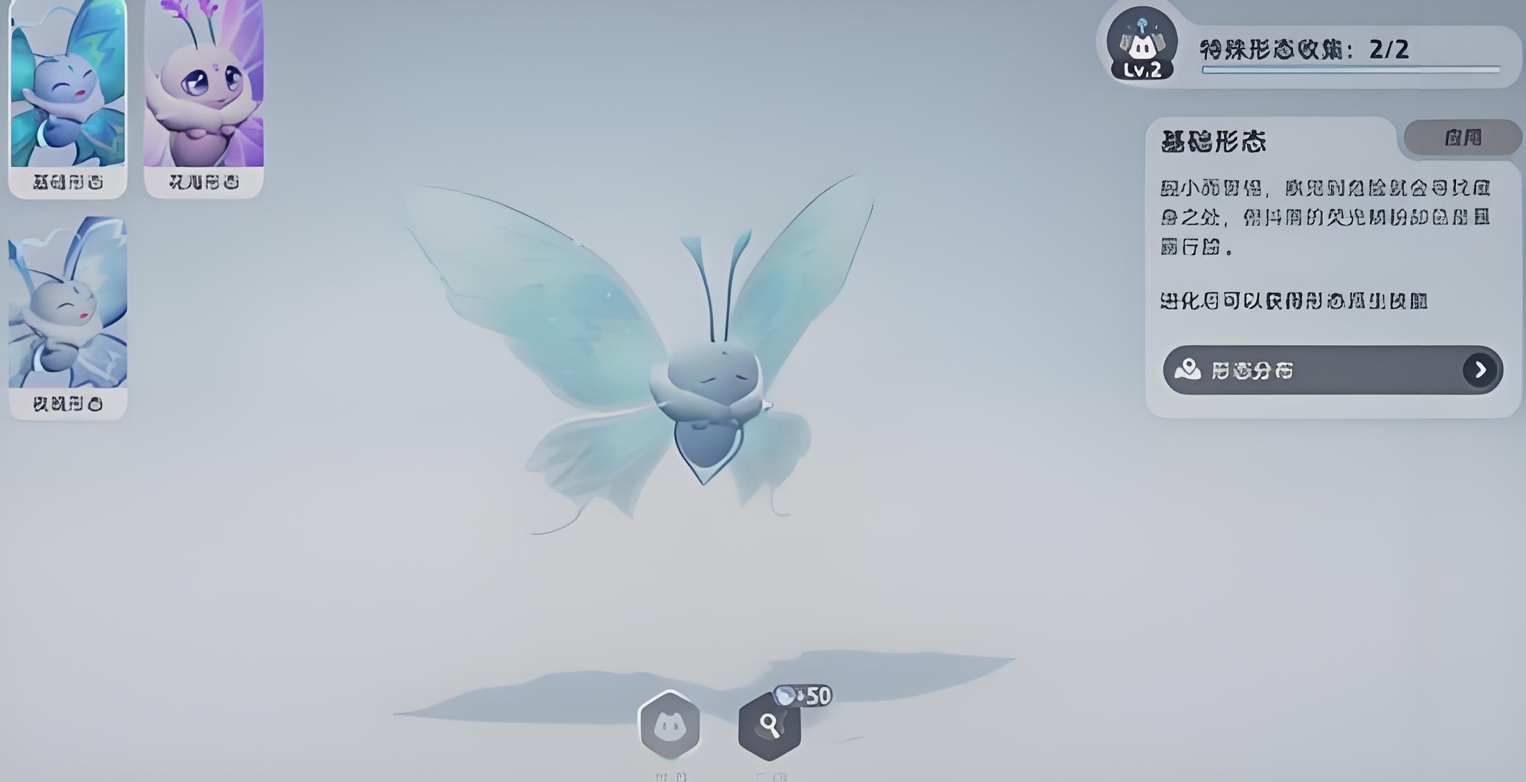 3、荧光蝶夜晚形态翅膀荧光转为淡蓝色,移动过程中会有闪烁光影特效,需在对应夜晚时段于草原花海区域遭遇,还能解锁专属研究点夜晚的聚会。