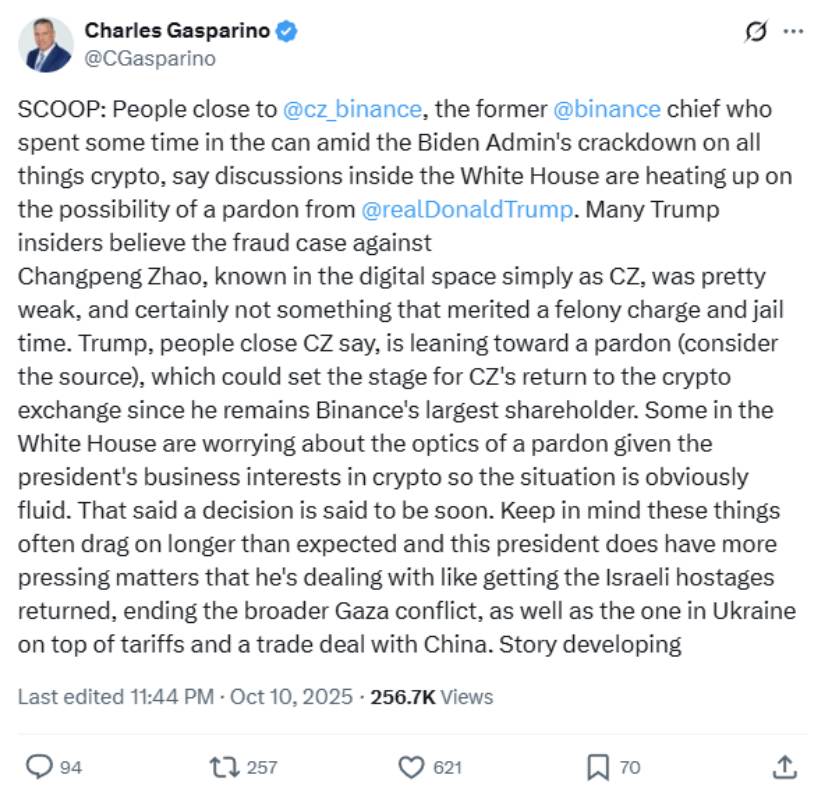 此次赦免历经币安数月游说,2025年5月CZ曾公开确认申请总统特赦。