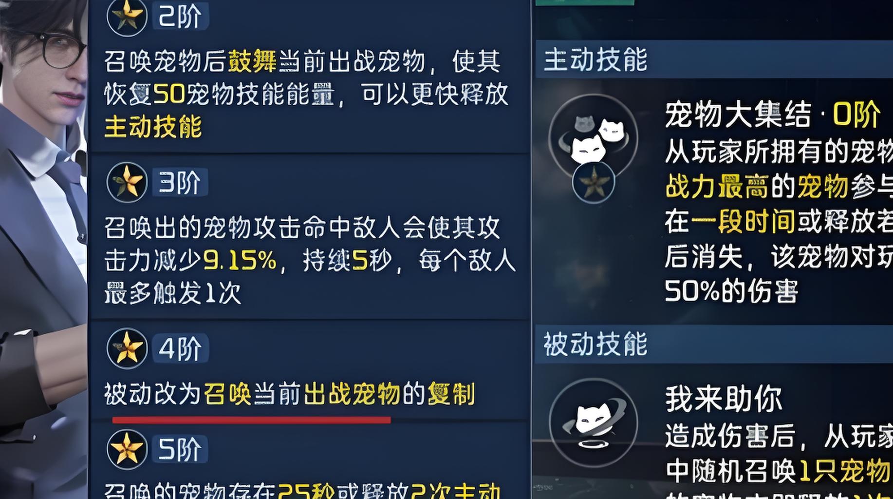 3、2阶召唤宠物后鼓舞出战宠物恢复50技能能量,4阶被动改为召唤当前出战宠物复制,5阶召唤宠物存在25秒或释放2次主动技能。