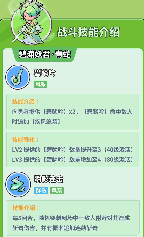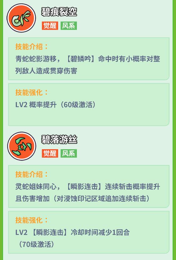 1、青蛇拥有碧鳞吟瞬影连击碧痕裂空碧落游丝四个风系技能,不同技能有各自核心效果,且随等级提升会得到强化,比如碧鳞吟等级提升后提供数量会增加。