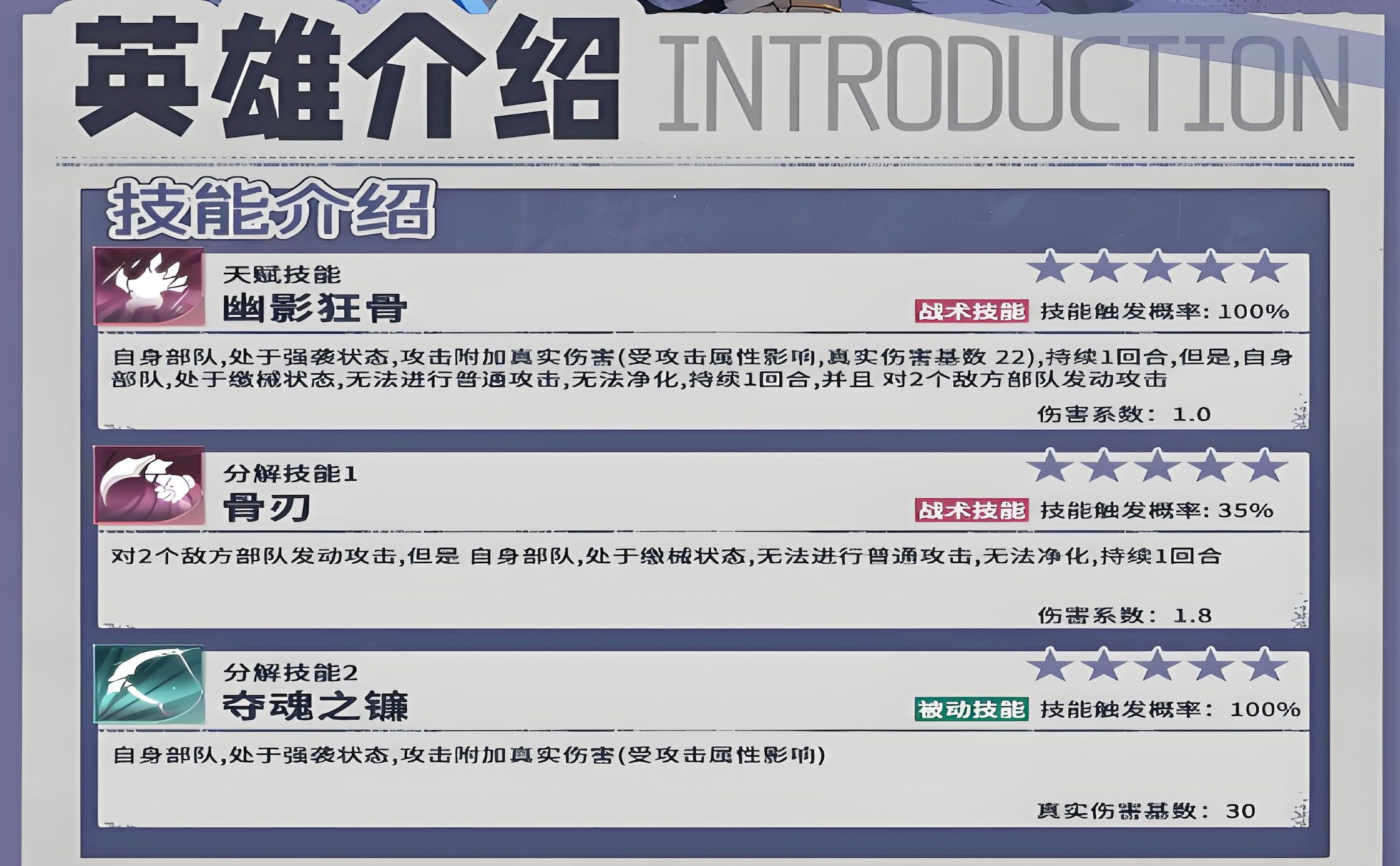 3、分解技能1骨刃触发概率有特定设定,对2个敌方部队发动攻击,自身部队缴械1回合且无法净化,分解技能2夺魂之镰触发概率固定,自身部队强袭。