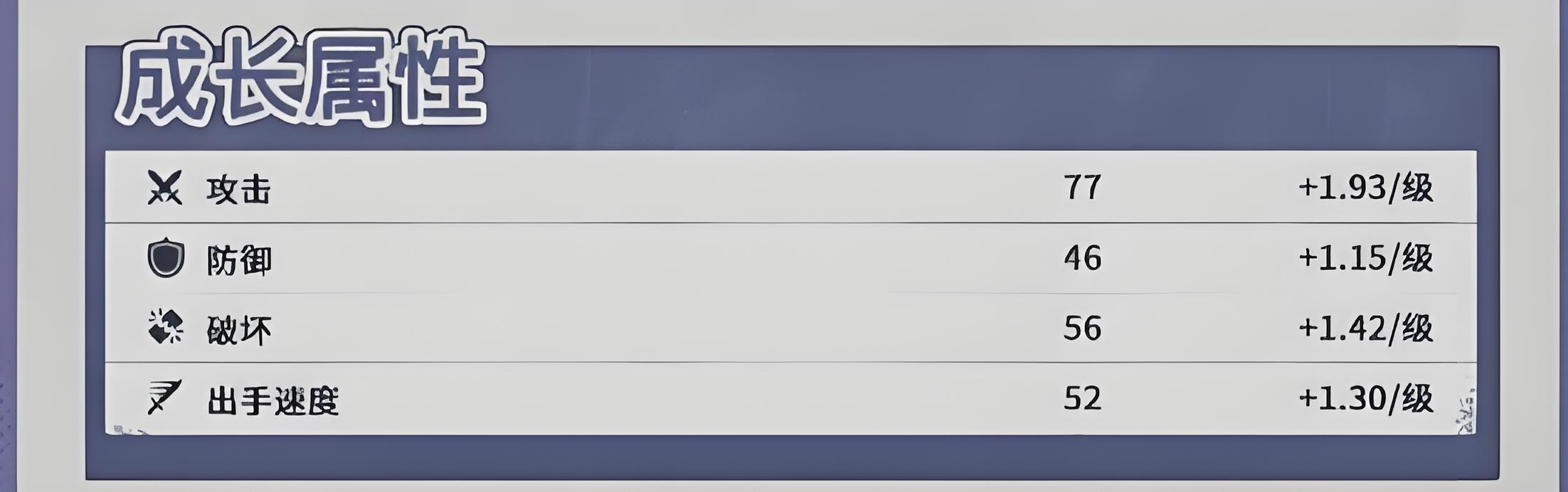 4、成长属性各维度明确,攻击、防御、破坏、出手速度均有基础数值与每级成长,整体成长趋势稳定,能支撑其输出定位需求。