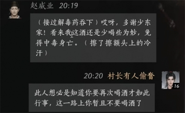 玩家:此人想必是知道你要再次喝酒才如此行事,这一路上你暂且不要喝酒了。
