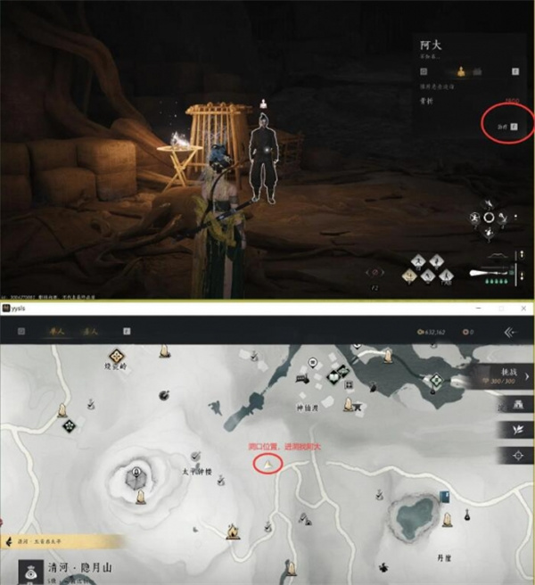 1、首先我们前往太平钟楼和神仙渡的山洞中找到阿大,洞口位置如下图所示;